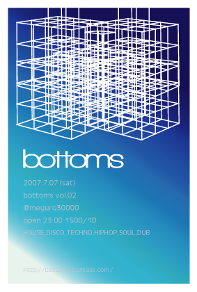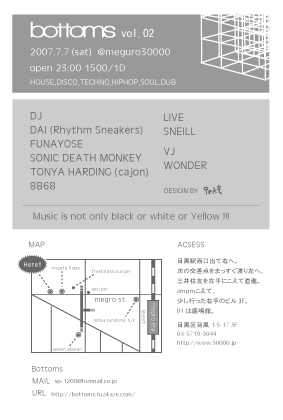 今、アメリカは日本よりクラブの規制が厳しいらしくてパーティーが二極化しているらしいです。スポンサーつけての金の臭いにするパーティーと面倒な規制を掻い潜ってやりたいことをしているパーティー。この"Sarcastic Disco"はまさしく後者のアンダーグラウンドパーティー。情報はウェブページのみで発信、開催場所は前日発表、ビルや倉庫などにサウンドシステムを持ち込んでのウェアハウスパーティー。音楽を純粋なものとしてとらえる"Sarcastic Disco"の精神は"bottoms"も受け継ぎたいところ。一度行ってみたい。